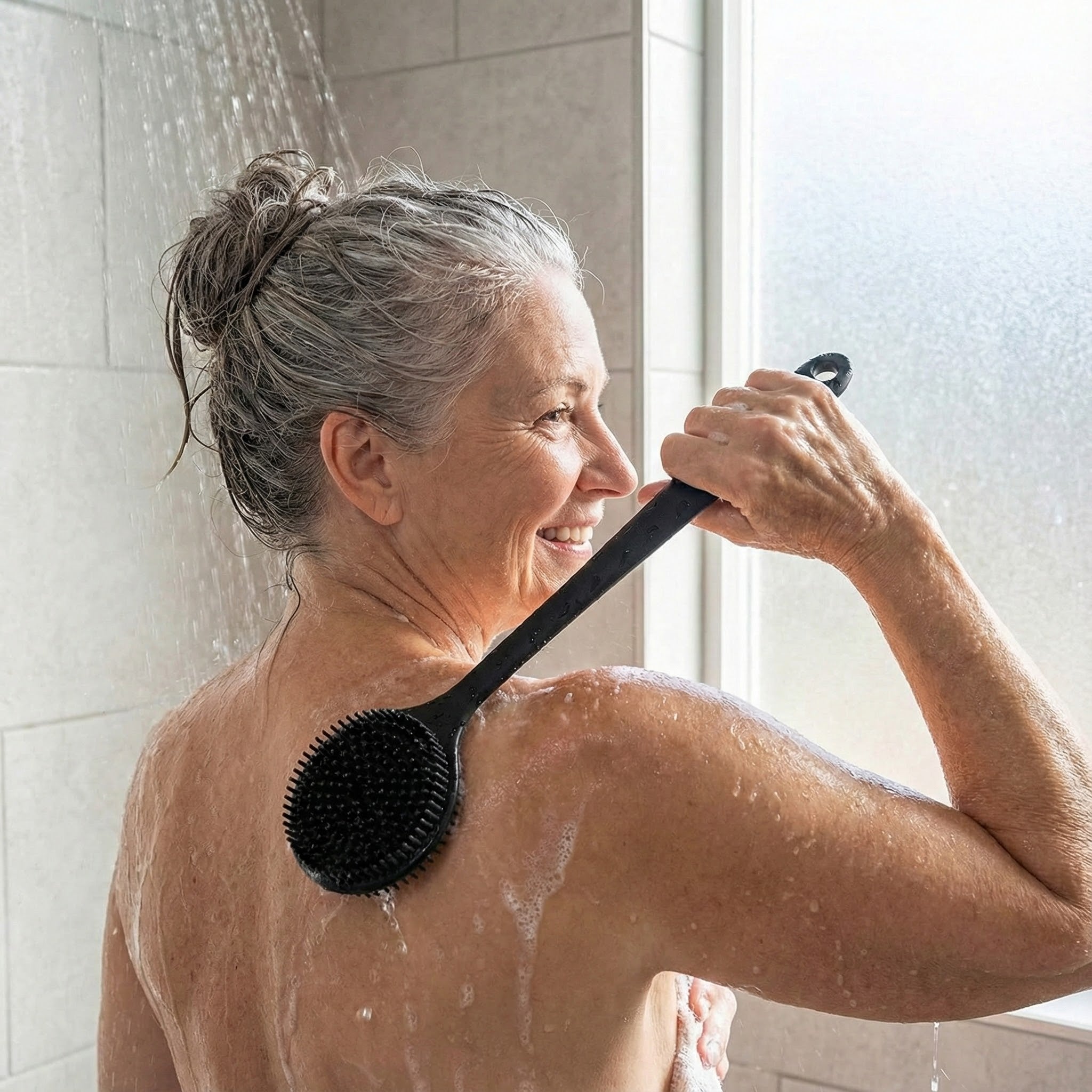 Gently glide the silicone bristles across your back - no twisting or reaching needed.